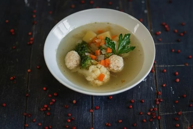 Состав: Курица отварная, картофель, клецки, морковь, лук, специи, масло растительное