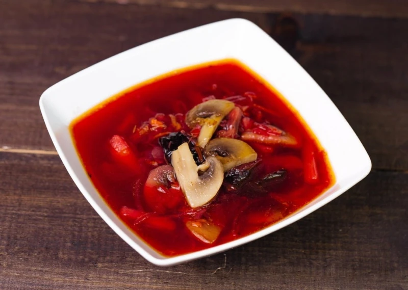 Состав: Свекла, картофель, капуста, грибы шампиньоны, морковь, лук, чернослив, чеснок, специи, масло растительное