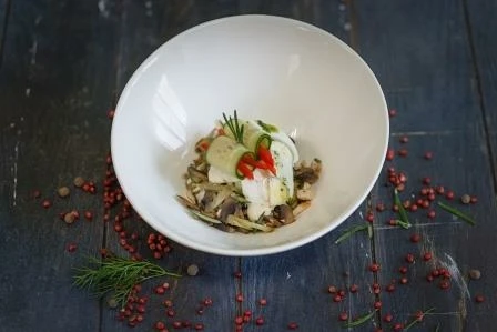 Состав: Филе куриное пряное, огурец свежий, огурец соленый, шампиньоны, яйцо, капуста китайская, майонез, соль, зелень