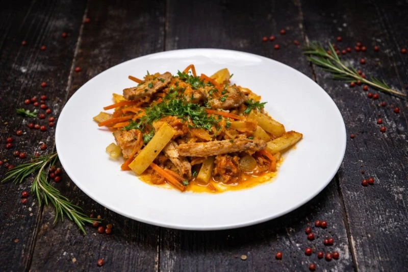 филе индейки,картофель,огурцы консервированные, лук, томатная паста, чеснок, специи.