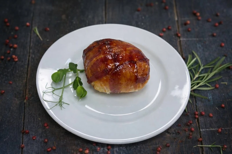 Состав: филе куриное, бекон,хлеб, яйцо, молоко, специи, яйцо, мука, лук.
